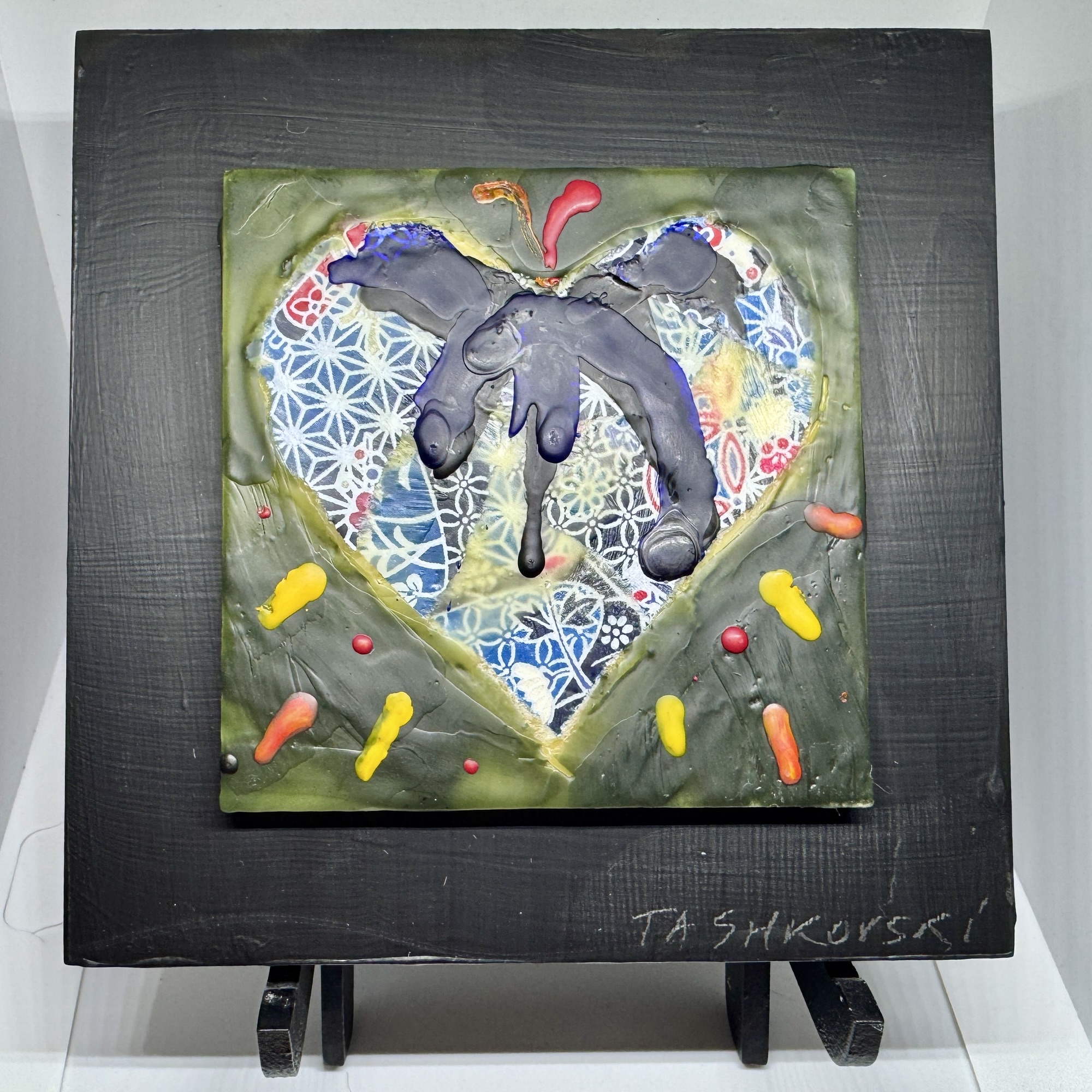 BERRY BERRY January 23, 2025 2000 × 2000 More New Hearts Karen Tashkovski, BERRY BERRY, 2025, encaustic & collage, 4″ x 4″ painting mounted on 6″ x 6″ chalkboard (with stand)