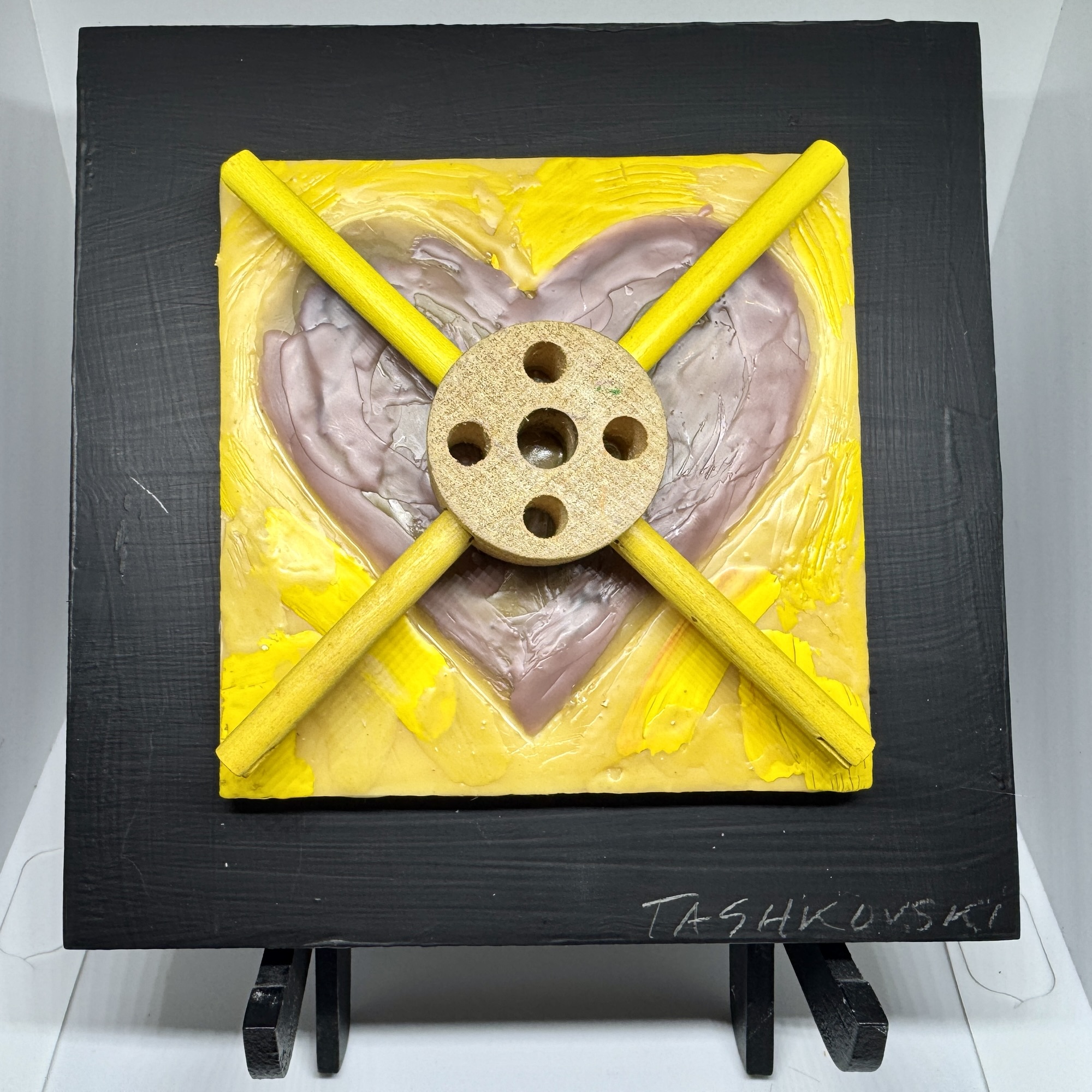 COMPLEMENTS January 23, 2025 2000 × 2000 More New Hearts Karen Tashkovski, COMPLEMENTS, 2025, encaustic & collage, 4″ x 4″ painting mounted on 6″ x 6″ chalkboard (with stand)