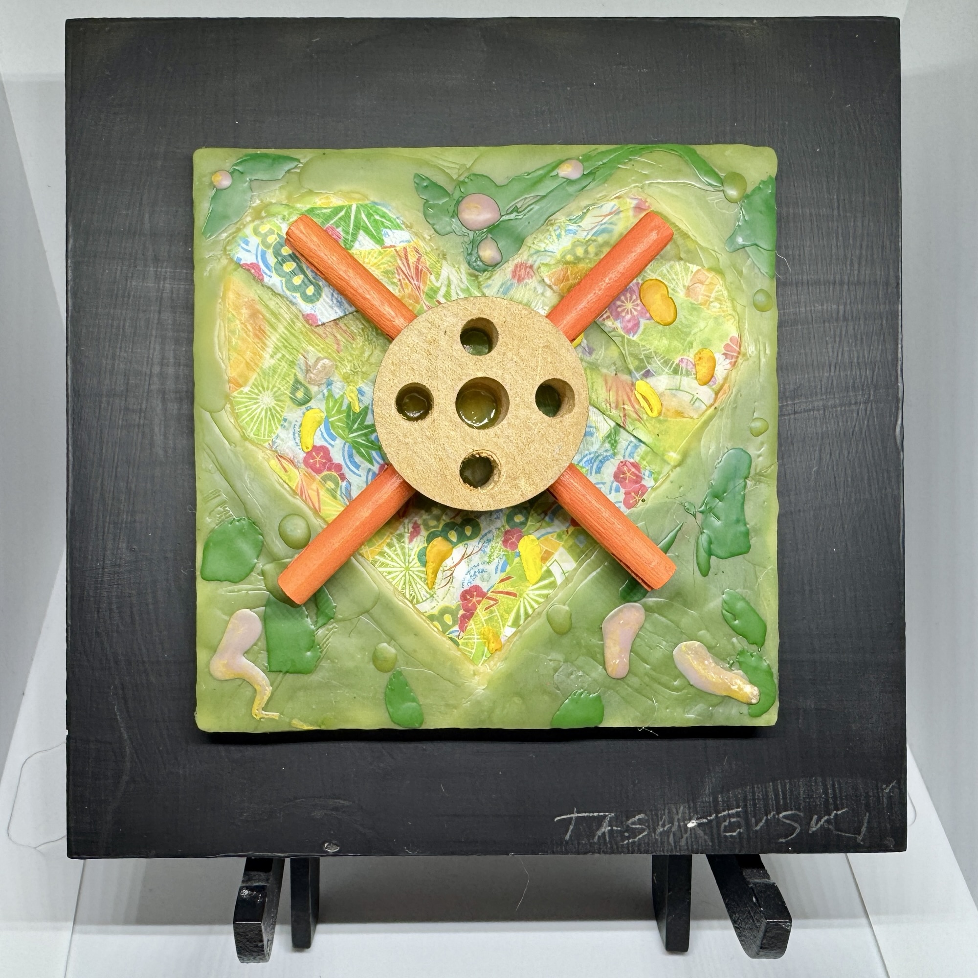 CRISS CROSS January 23, 2025 2000 × 2000 More New Hearts Karen Tashkovski, CRISS CROSS, 2025, encaustic & collage, 4″ x 4″ painting mounted on 6″ x 6″ chalkboard (with stand)
