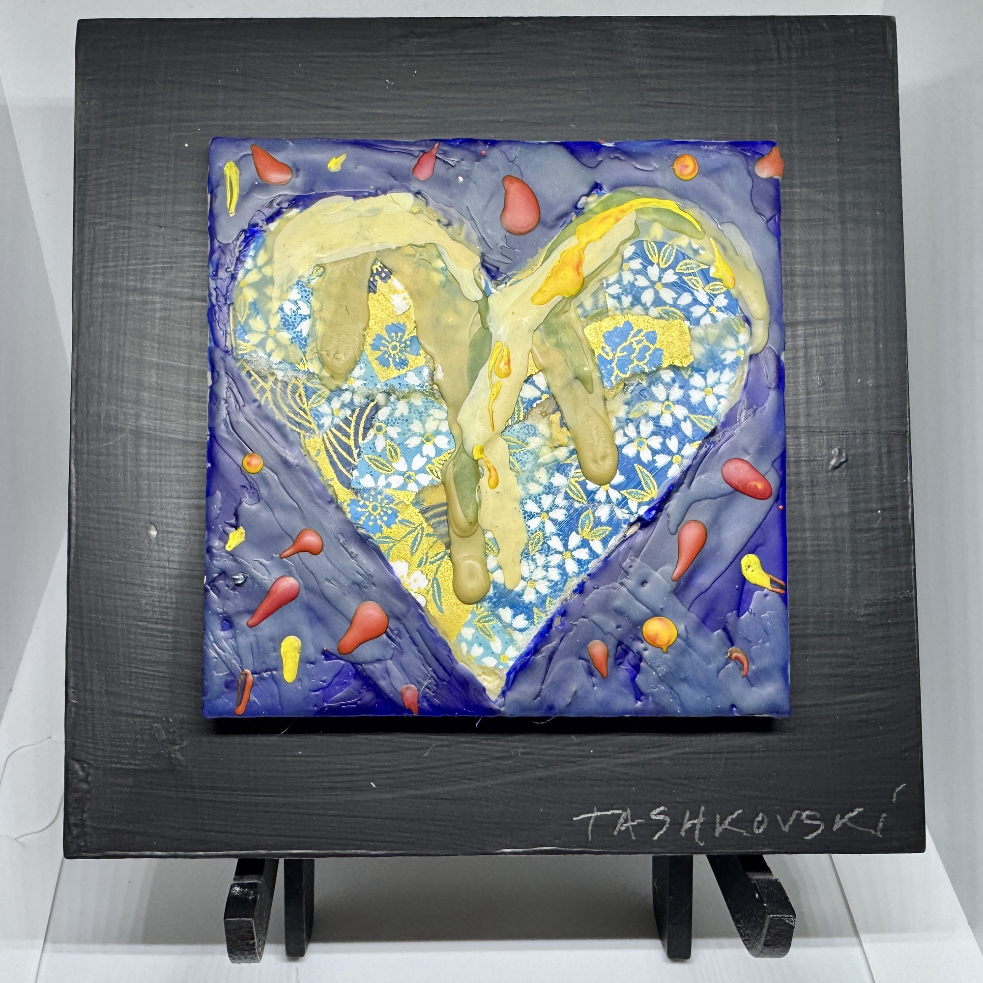 FESTIVE January 23, 2025 2000 × 2000 More New Hearts Karen Tashkovski, FESTIVE, 2025, encaustic & collage, 4″ x 4″ painting mounted on 6″ x 6″ chalkboard (with stand)