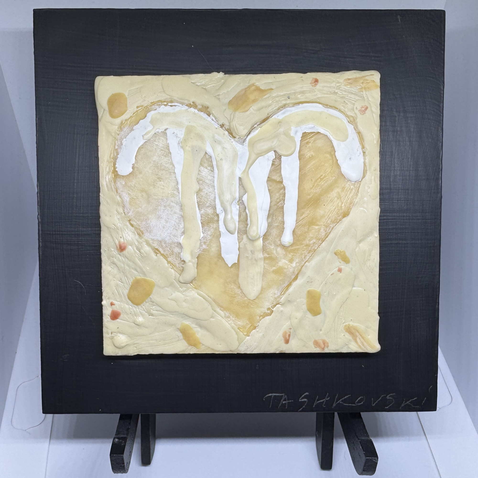 FRENCH VANILLA January 23, 2025 2000 × 2000 More New Hearts Karen Tashkovski, FRENCH VANILLA, 2025, encaustic & collage, 4″ x 4″ painting mounted on 6″ x 6″ chalkboard (with stand)