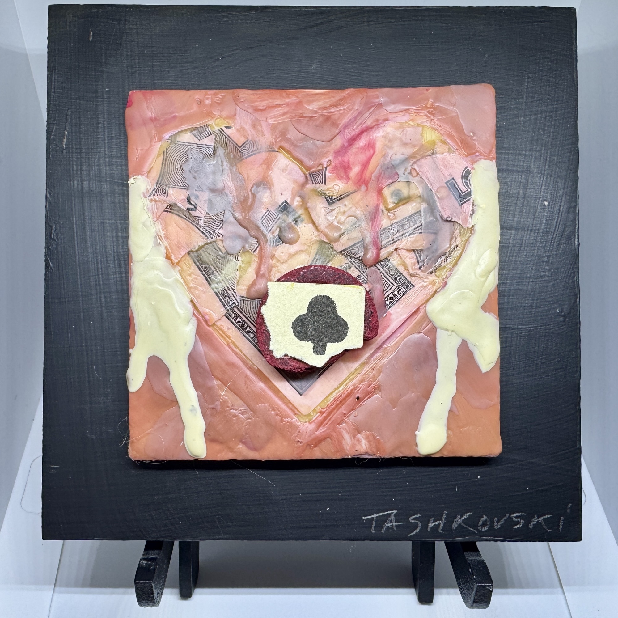 ROSY January 23, 2025 2000 × 2000 More New Hearts Karen Tashkovski, ROSY, 2025, encaustic & collage, 4″ x 4″ painting mounted on 6″ x 6″ chalkboard (with stand)