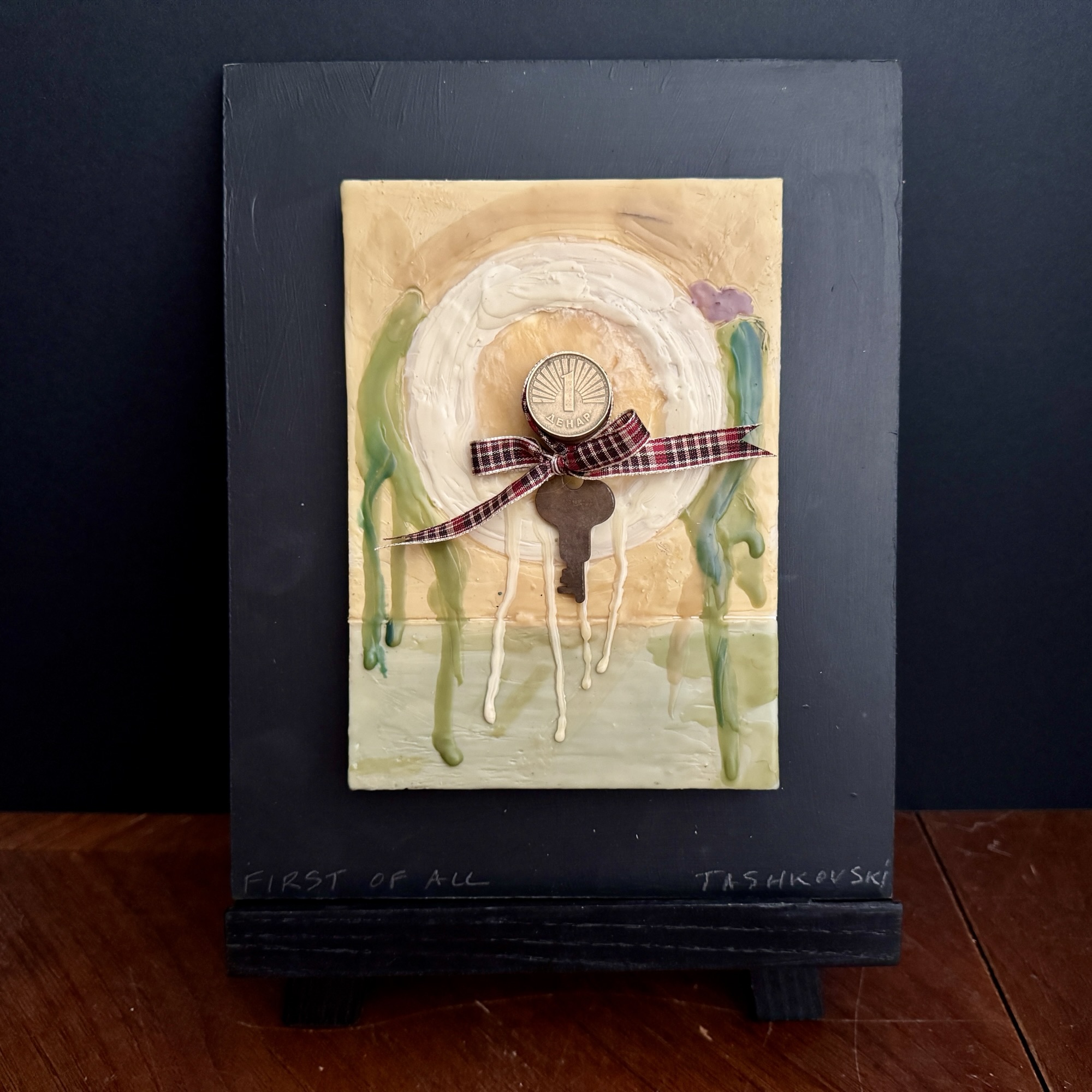 FIRST OF ALL January 23, 2025 2000 × 2000 Arcadia 2 Karen Tashkovski, FIRST OF ALL, 2025, encaustic & collage, 5″ x 7″ hardboard mounted on 8″ x 10″ chalkboard (with stand)