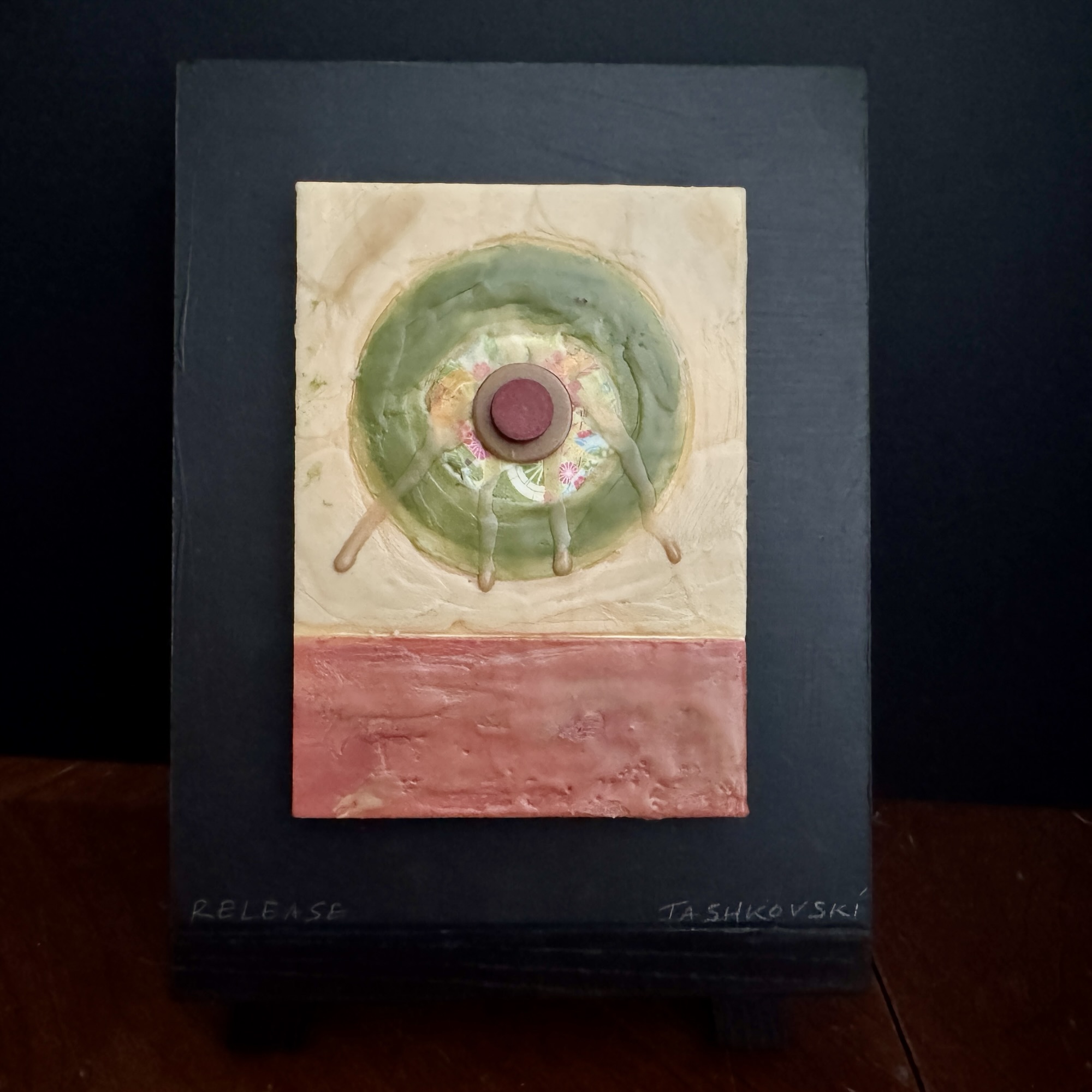 RELEASE January 23, 2025 2000 × 2000 Arcadia 2 Karen Tashkovski, RELEASE, 2025, encaustic & collage, 5″ x 7″ hardboard mounted on 8″ x 10″ chalkboard (with stand)