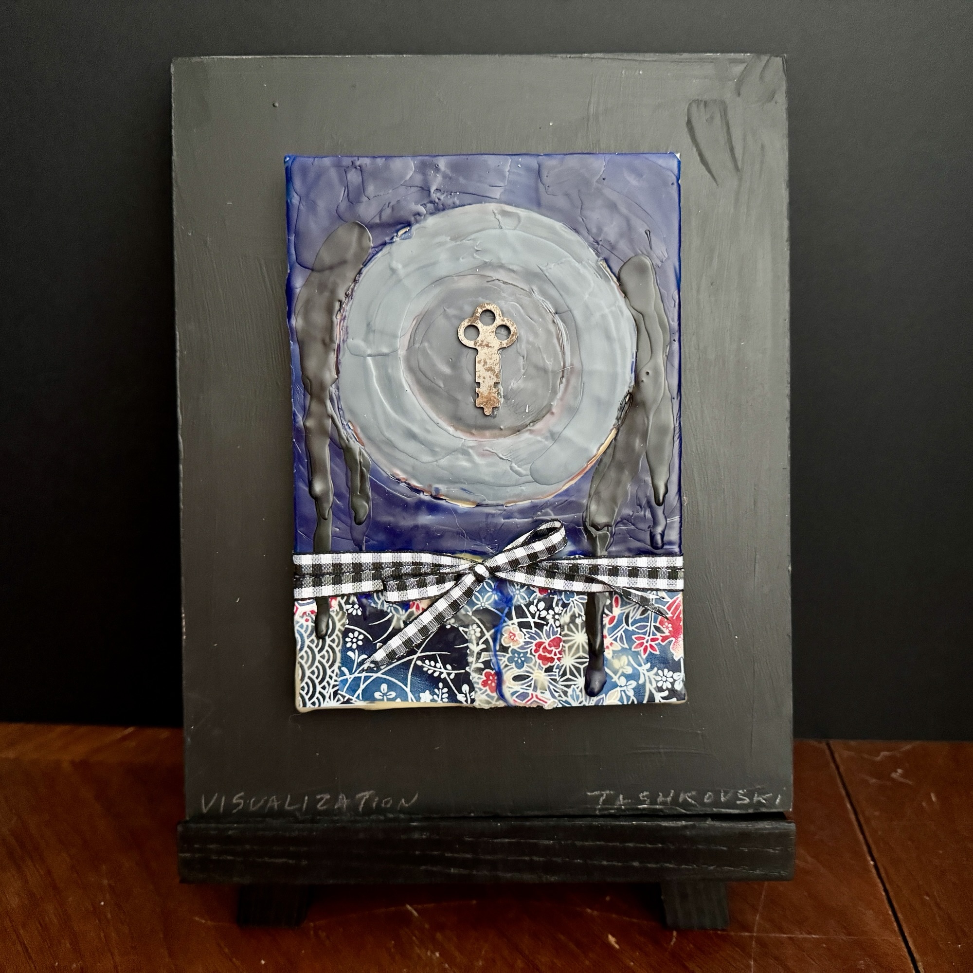 VISUALIZATION January 23, 2025 2000 × 2000 Arcadia 2 Karen Tashkovski, VISUALIZATION, 2025, encaustic & collage, 5″ x 7″ hardboard mounted on 8″ x 10″ chalkboard (with stand)